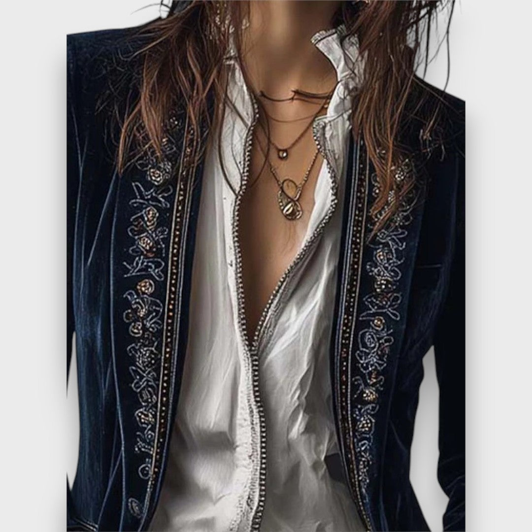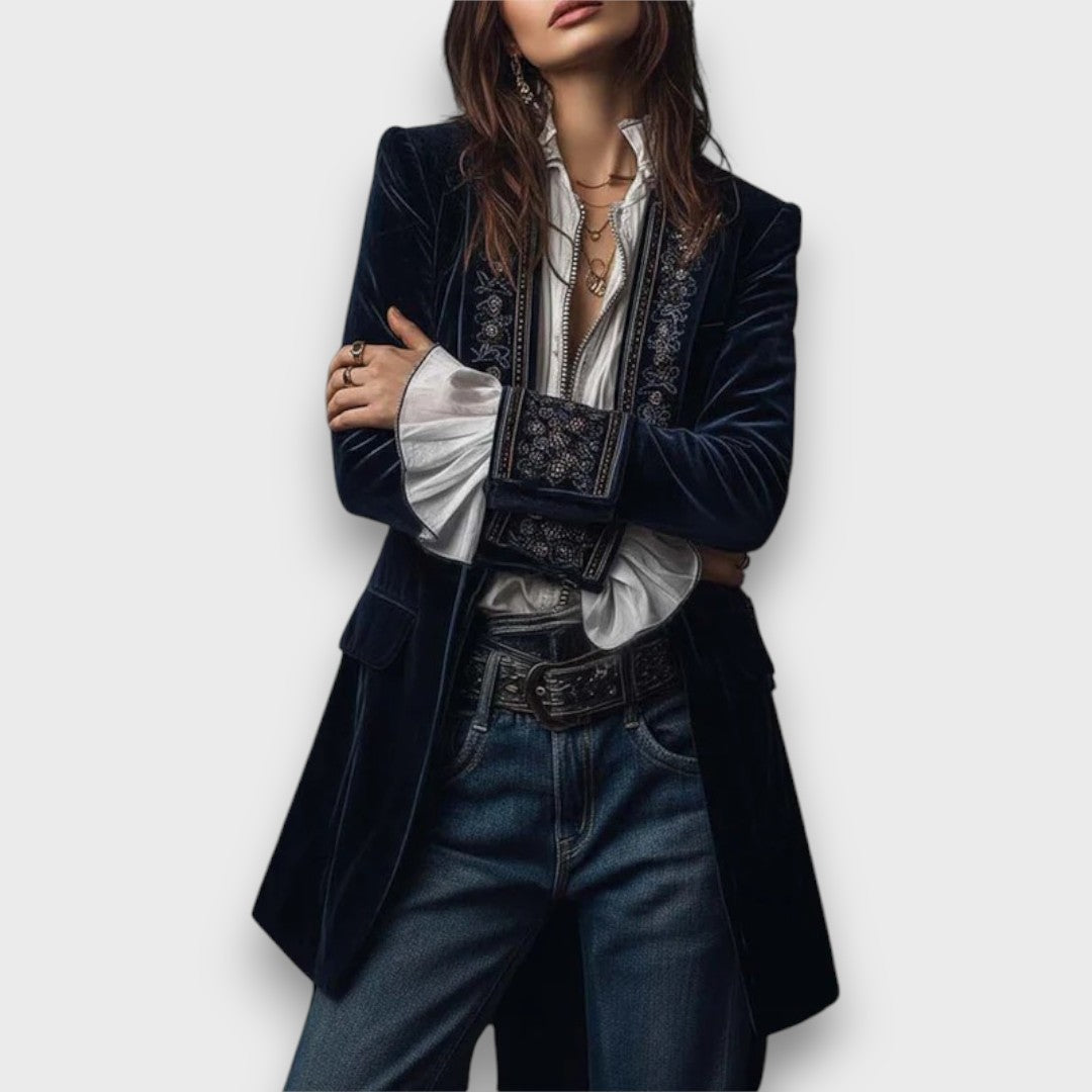 Karielle brings a refined, artistic edge to modern dressing — a velvet jacket that feels luxurious without ever trying too hard. Its rich, deep finish sets the stage for intricate embroidery along the lapels and cuffs, adding quiet opulence to a silhouette that’s both tailored and effortlessly relaxed. Soft to the touch yet structured in all the right places, it elevates denim, dresses, and every in-between moment with a feeling of confident sophistication.